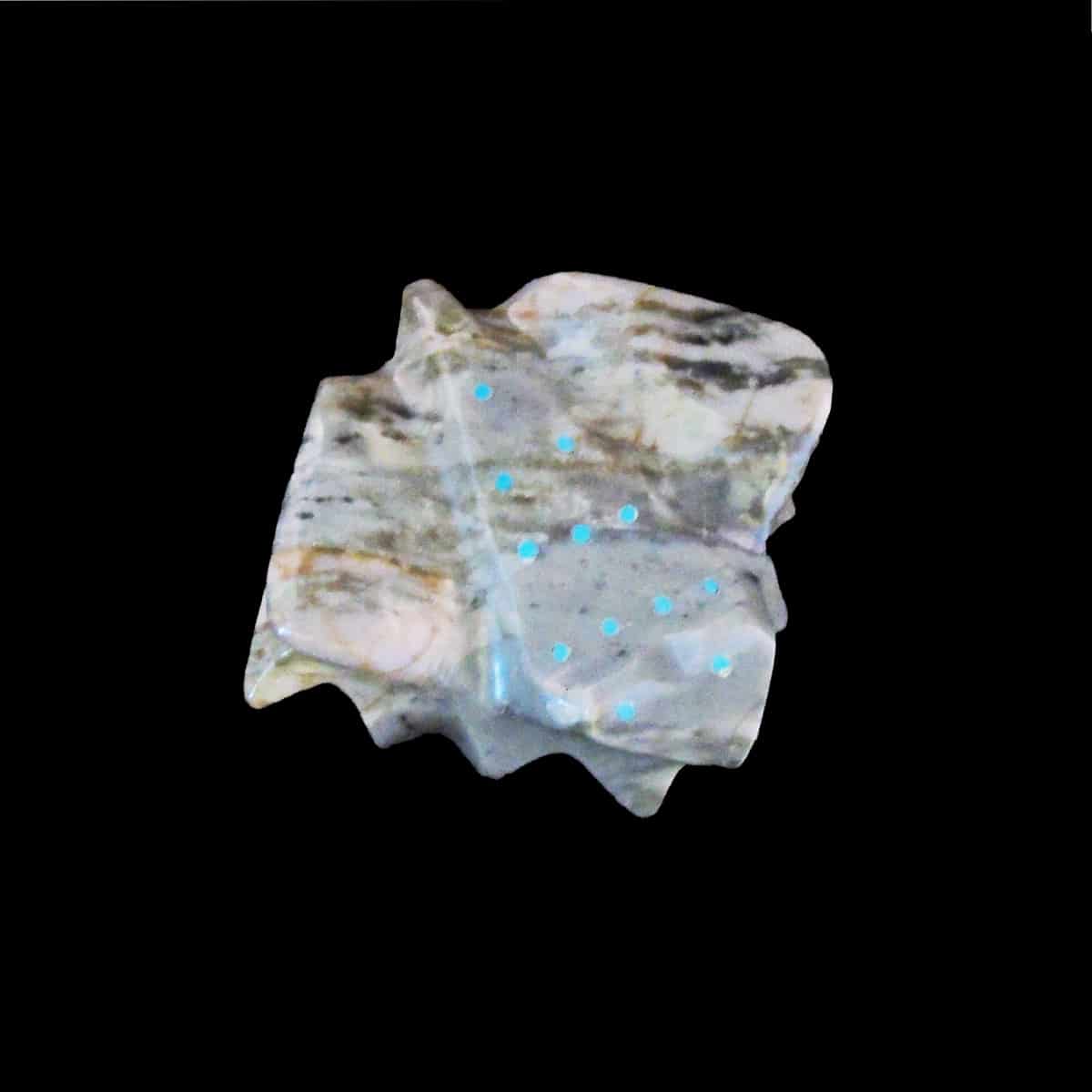 Explore the unique craftsmanship of Zuni artist Allison Wallace with this captivating Zuni frog fetish, meticulously hand-carved from dolomite. Enhanced with delicate turquoise design accents, this piece reflects Wallace’s dedication to traditional Native American artistry. Perfect for collectors and admirers of cultural treasures, this dolomite frog fetish embodies the spiritual and artistic essence of Zuni craftsmanship, making it a cherished addition to any collection or a thoughtful gift.