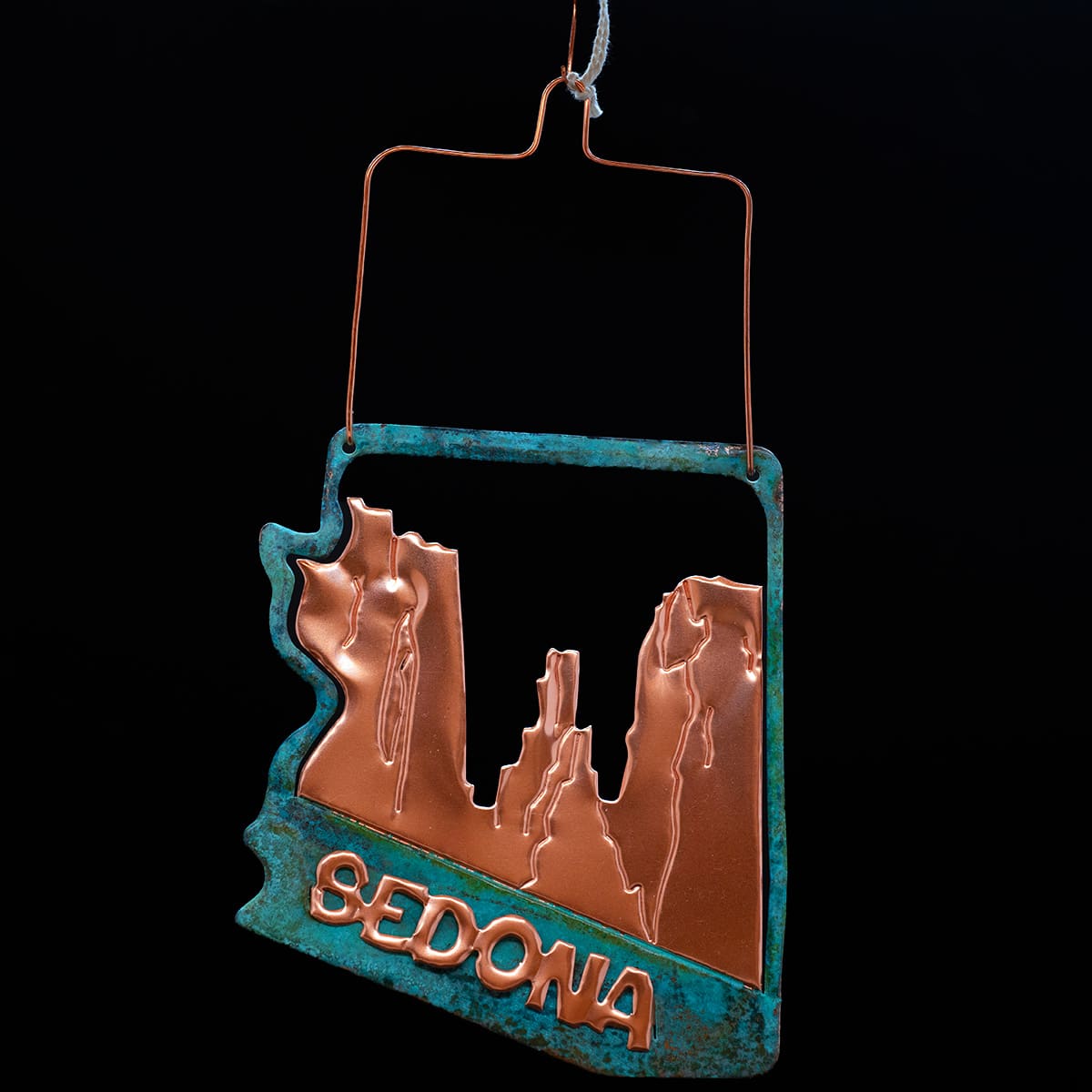 Artistically handcrafted ornaments made here in Copper State of Arizona, USA. Created using thin sheets of genuine American copper, mixed verdigris (weathered) and bright copper finishes with protective non-yellowing acrylic coating.