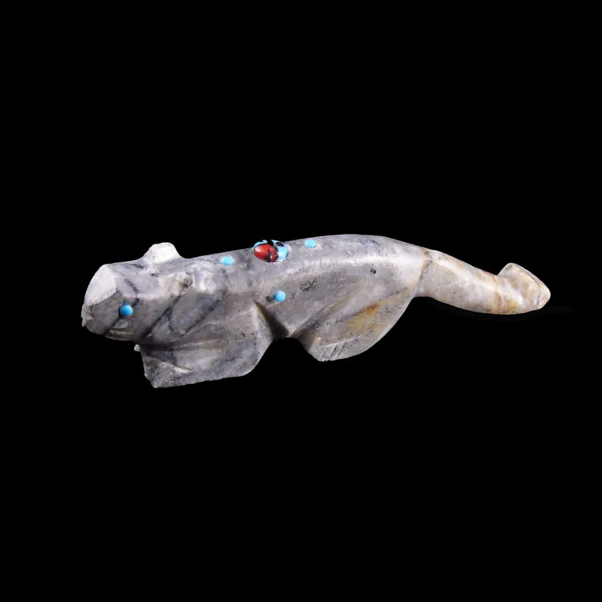 Zuni Fetishes are small carvings made from various materials such as bone, shells, and gemstones by the Zuni people. These carvings traditionally serve a ceremonial purpose for their creators and depict animals and icons integral to their culture. Each animal has great significance and meaning, many with protective abilities or healing powers. Fetish carvings are believed to have magical powers and protect or enhance the owner or craftsman. It is presumed to properly care for Zuni Fetishes that they should be given offerings of cornmeal and kept in special turquoise-encrusted fetish pots or pouches. The Zuni also divided the world into six regions or directions: north, west, south, east, above, and below. Each direction is represented by a Prey God, or guardian animal, and is listed as follows: north — the yellow mountain lion, west — the black bear (represented by the color blue), south — the red badger, east — the white wolf, above or the sky — the multi-colored eagle, below or underground — the black mole. These directional animals are among the most powerful and are the guardian and masters of their region. Collectors worldwide collect fetishes as a form of contemporary Native American art with an appreciation for the craftsmanship and meaning behind each fetish. The meaning of each is provided within the product. However, over time many carvers started to create some non-traditional animals due to requests, region, and popularity. These non-traditional fetishes may not have the significance or abilities of other more traditional fetish carvings.