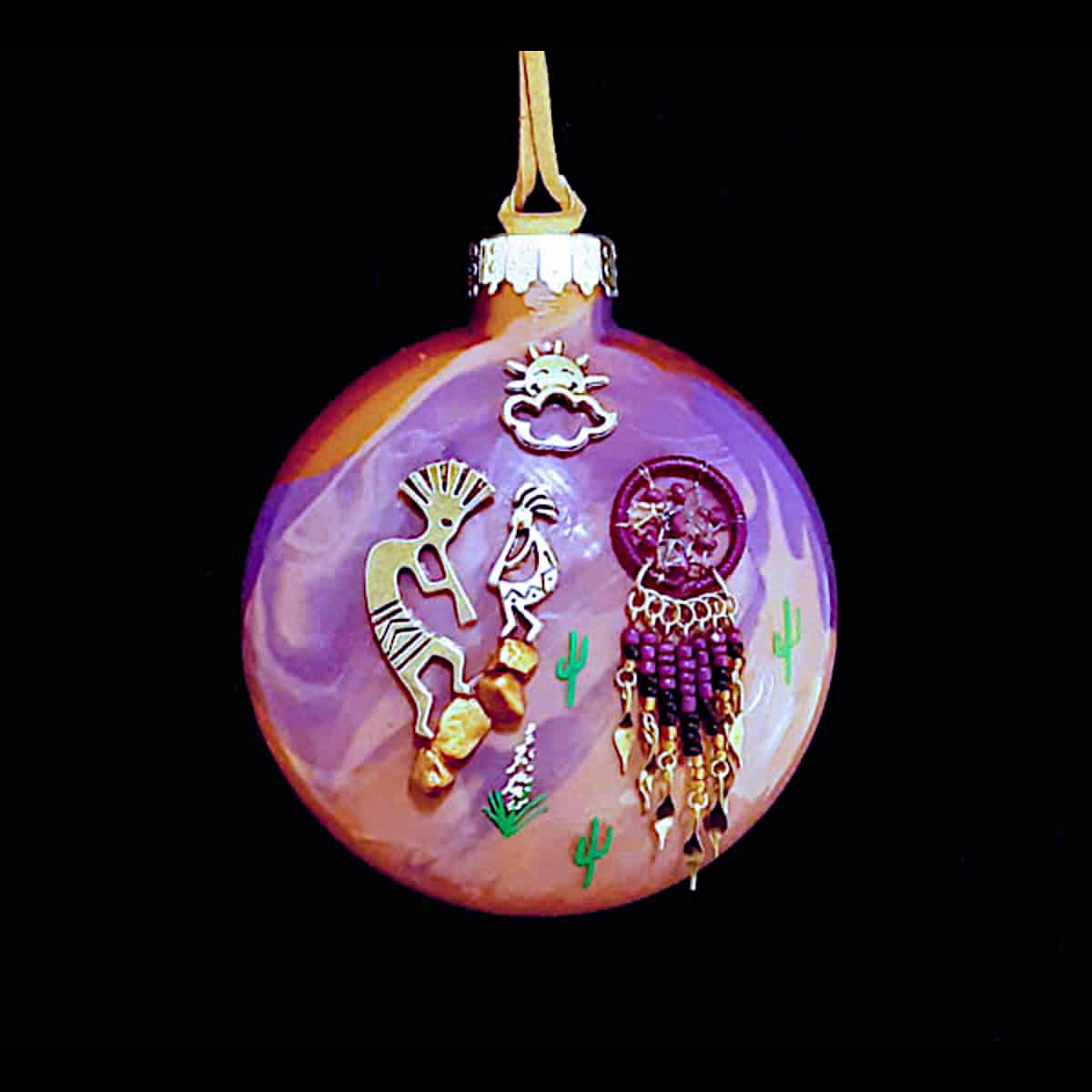 These hand crafted ornaments, glass Christmas ornaments, are made locally here in Arizona by well-known southwest artist Bette Fraser Day. A great authentic southwest Christmas ornament to add to your Christmas tree ornament collection. Each one of these genuine Southwest Christmas ornaments is uniquely made and designed, similar but no two are ever alike! The southwest glass ornaments are individually signed by Bette Day and would make a great gift to any southwest art collector, friend, or family member. Collect all of Bette Days ornaments to decorate your tree or house in a matching stylish southwest Christmas theme.