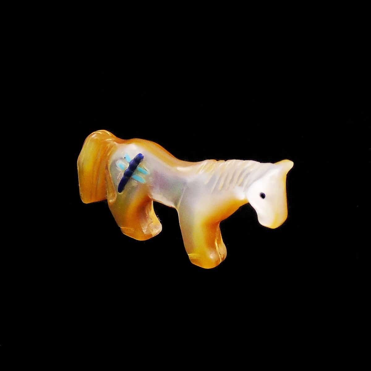 Zuni Fetishes are small carvings made from various materials such as bone, shells, and gemstones by the Zuni people. These carvings traditionally serve a ceremonial purpose for their creators and depict animals and icons integral to their culture. Each animal has great significance and meaning, many with protective abilities or healing powers. Fetish carvings are believed to have magical powers and protect or enhance the owner or craftsman. It is presumed to properly care for Zuni Fetishes that they should be given offerings of cornmeal and kept in special turquoise encrusted fetish pots or pouches. The Zuni also divided the world into six regions or directions: north, west, south, east, above, and below. Each direction is represented by a Prey God, or guardian animal, and are listed as follows: north – the yellow mountain lion, west – the black bear (represented by the color blue), south – the red badger, east – the white wolf, above or the sky – the multi-colored eagle, below or underground – the black mole. These directional animals are among the most powerful and are the guardian and masters of their region. Collectors worldwide collect fetishes as a form of contemporary Native American art with an appreciation for the craftsmanship and meaning behind each fetish. The meaning of each is provided within the product. However, over time many carvers started to create some non-traditional animals due to requests, region, and popularity. These non-traditional fetishes may not have the significance or abilities of other more traditional fetish carvings.