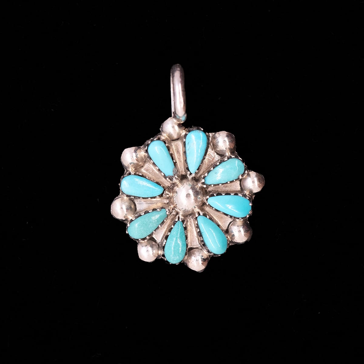This elegant Zuni flower pendant by artisan P. Leekity showcases the timeless beauty of petit point turquoise work, a hallmark of traditional Zuni craftsmanship. Each teardrop-shaped turquoise stone is hand-cut and precisely set in a symmetrical floral pattern, radiating from a central silver bead. The stones are framed in fine sterling silver bezels, with delicate silver beadwork encircling the design to enhance its dimensionality and charm.